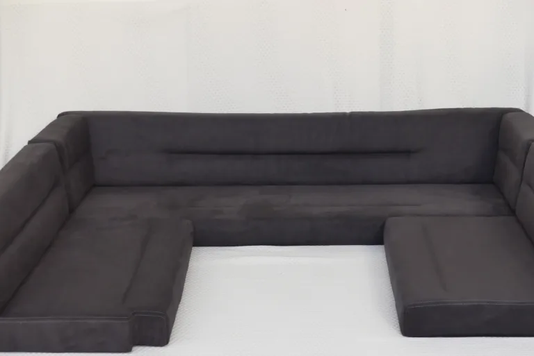 Modularer Schlafbereich mit grau-blauen Polstern, Holzrückwand, Leselampen, Aufbewahrungstaschen und einer Pflanze